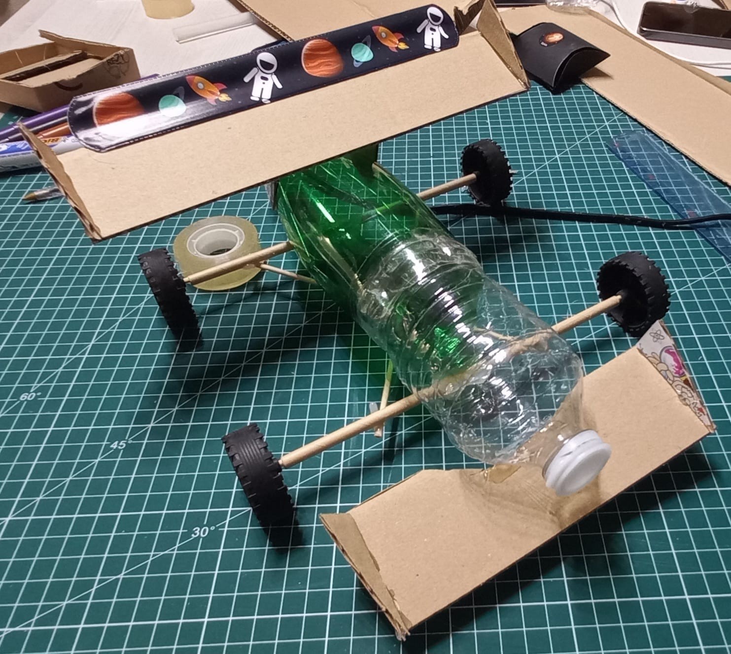 26- Essayes de ne pas bloquer l'ouverture du bouchon de la bouteille transparente. Lorsque ton dragster va partir, il risque de cabrer. Donc, pour éviter cela, on met un peu d'eau sur la partie avant, ce qui compensera le déséquilibre du tir.